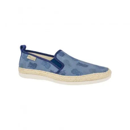 Las zapatillas de esparto estilo manoletina de la marca Potomac, Modelo 521, tienen un diseño distintivo con un estampado de piñas en color azul.