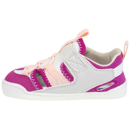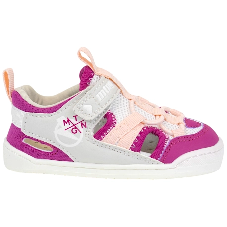 Sandalias para bebés en color rosa con detalles blancos y grises. Estética moderno y fresco con aperturas laterales, que mantendrán sus pies mejor ventilados. Su diseño barefoot está desarrollado en colaboración con el Dr. Juanjo López, traumatólogo deportivo e infantil, para que respete el desarrollo natural de sus pies.