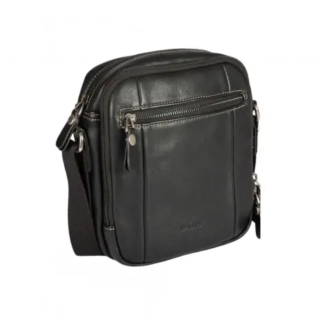 Bolso color negro fabricado en piel sintética de buena calidad, tiene varios compartimientos que cierran con cremallera. Detalle de costuras verticales y asa ajustable.