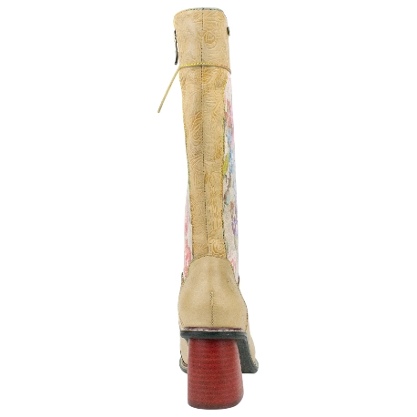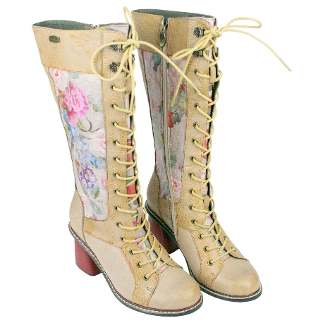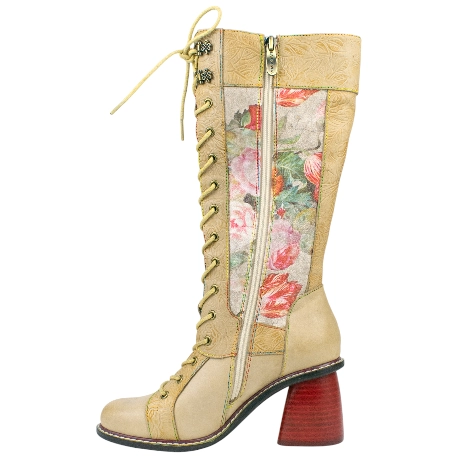 Bota alta de vestir para mujer, fabricada con 70% piel y 30% textil de primera calidad. Su estética romántica con patrones florales, grabados y costuras visibles, la hacen toda una obra de arte.