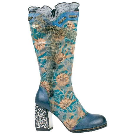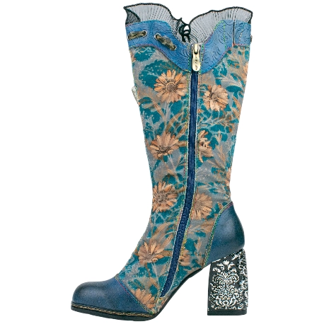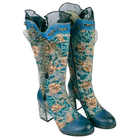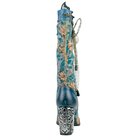 Botas altas elegantes para mujer, fabricadas en piel natural y terciopelo estampado de flores. decorada con lazo estampado y negro.