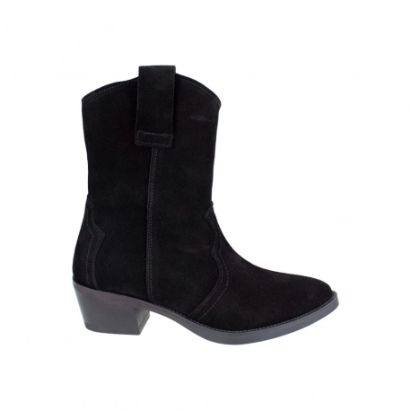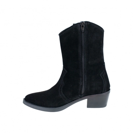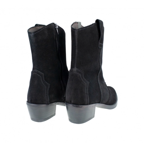 Botines Camperos Mujer en negro fabricado en serraje (piel) de primera calidad y hechura artesanal. Cierre de cremallera interior. Forro interior textil y plantilla muy cómoda. Suela de goma con tacón cuadrado clásico de 5 centímetros. Punta afilada, horma normal.