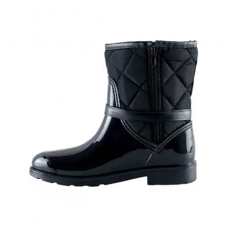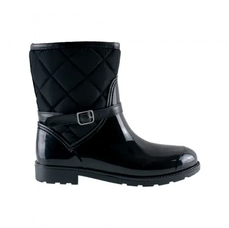 Botín estilo katiuska de caña baja guateada, fabricado en goma color negro.
