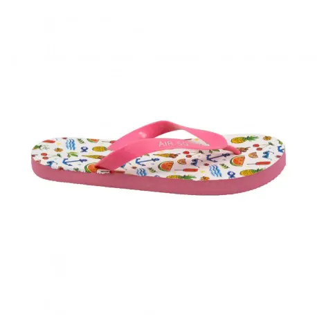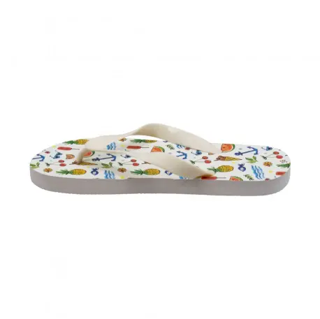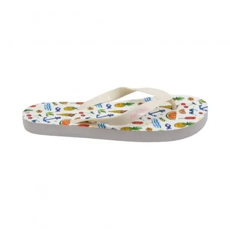 Sandalias de goma estilo chancla con divertido y juvenil diseño veraniego. Fabricadas enteramente en goma con separación de dedo. Horma estándar, calza normal.