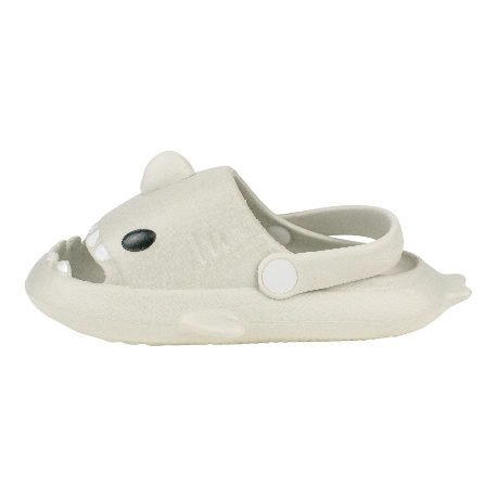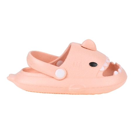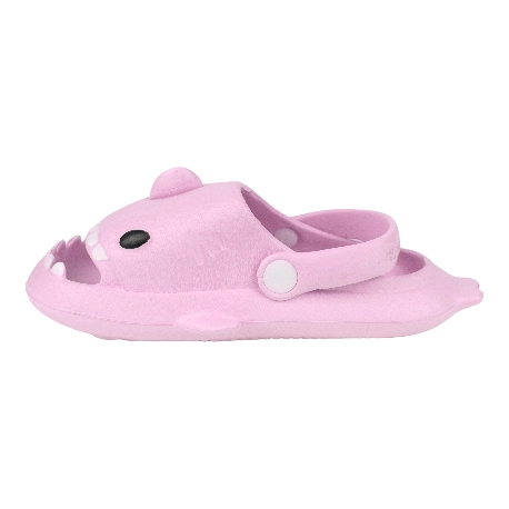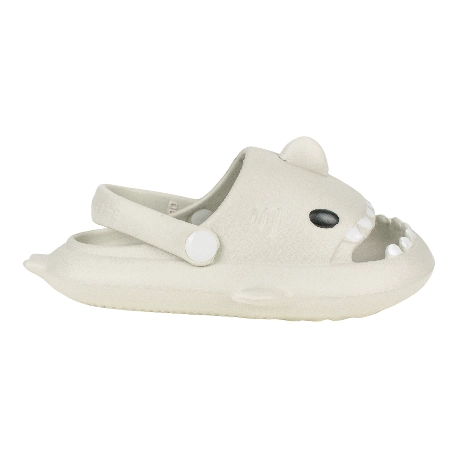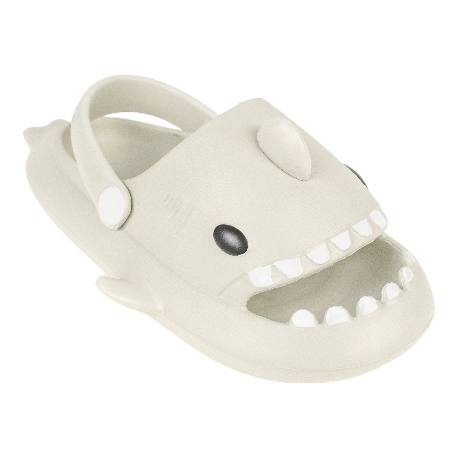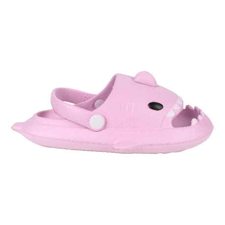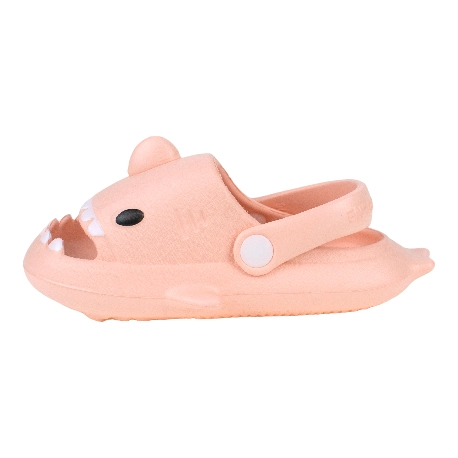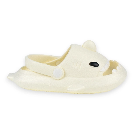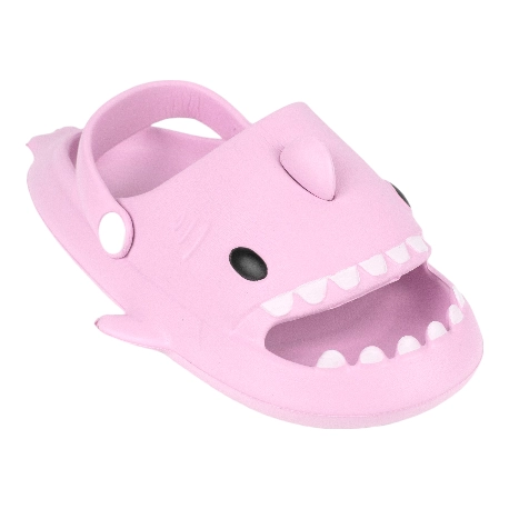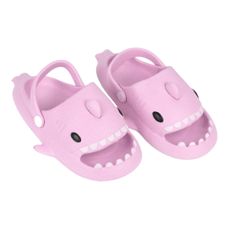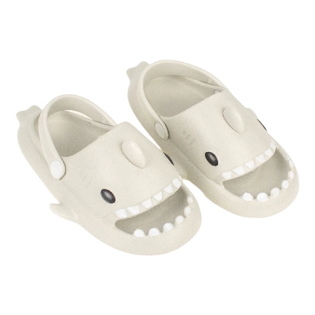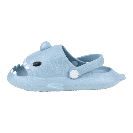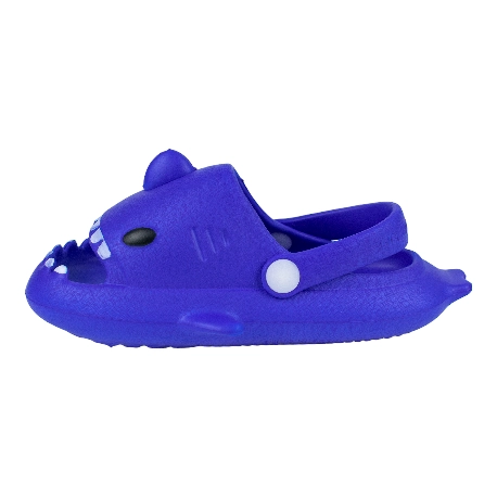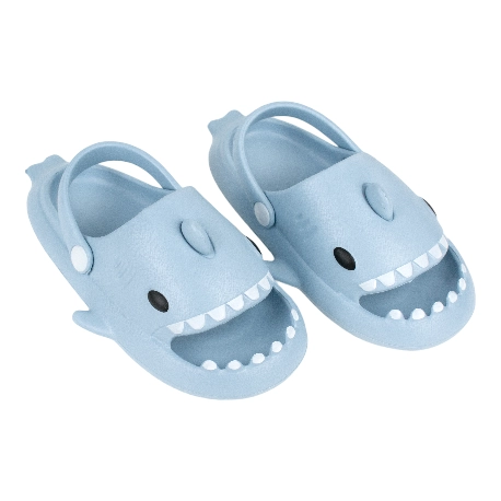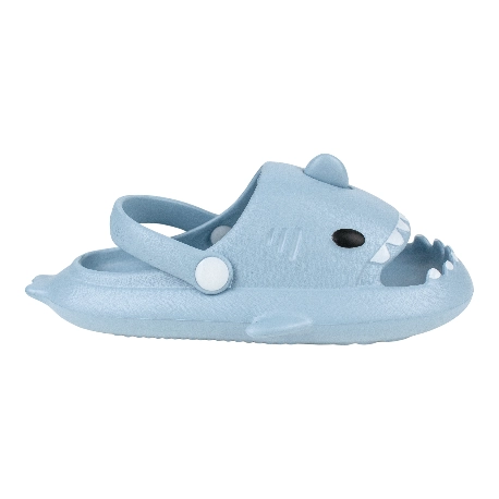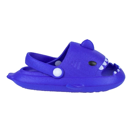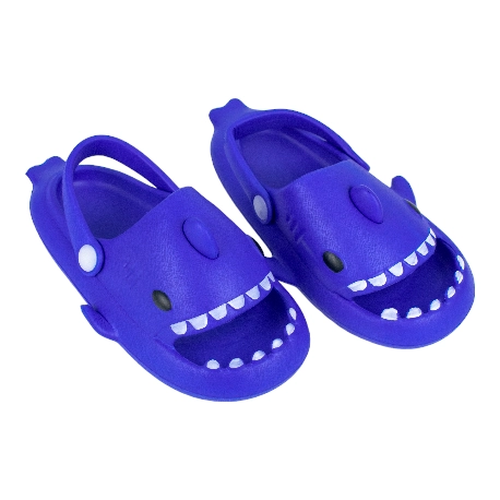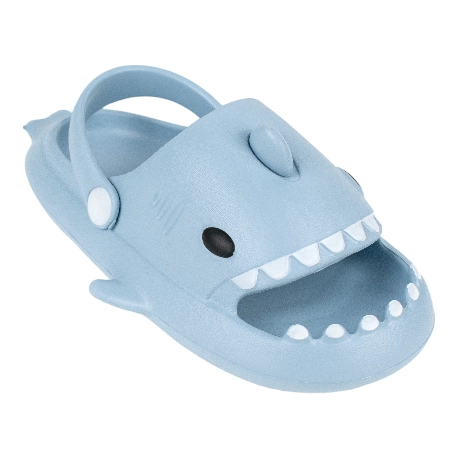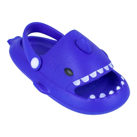 Sandalias de goma para niños tipo chancla con motivo de tiburón, fabricada en varios colores todos con una tira que sujeta el tobillo.