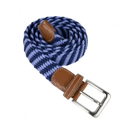 Cómodo cinturón fabricado en tela elástica en colores azules, detalles de piel marrón y hebilla de metal. Estilo casual.