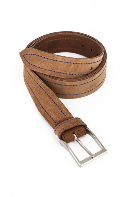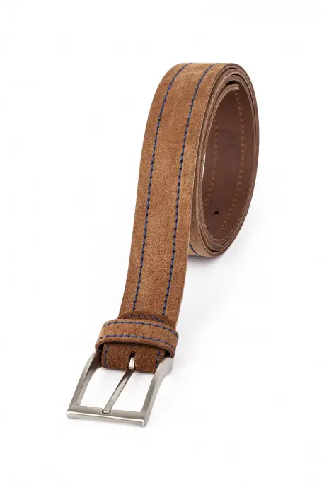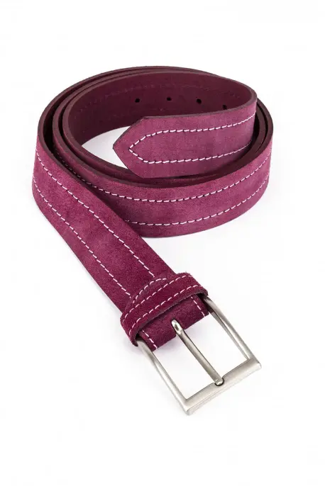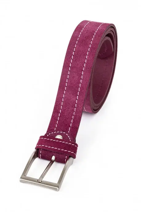 Cinturón de seraje con cosidos combinados. Los cinturones están combinados en morado con cosidos rosas, en color cuero con cosidos verde y azul marino con cosido color cuero.