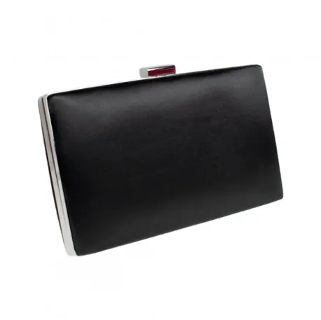 El bolso de fiesta de la marca Azarey en color negro satinado y plata es un elegante accesorio que aportará sofisticación a cualquier look de fiesta. Su estilo es de caja, lo que le da una forma rectangular y estructurada que permite mantener su forma aún cuando esté vacío.