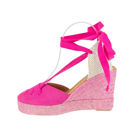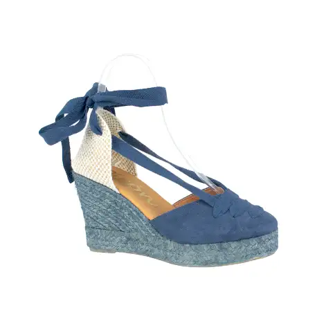 Elaboradas en suave serraje de alta calidad y adornadas con una trenza de esparto teñida de 7 cuerdas, estas cuñas ofrecen una estética única y una sensación de lujo en cada paso. Su doble plataforma garantiza una pisada estable, mientras que los lazos de algodón añaden un toque de delicadeza y feminidad.