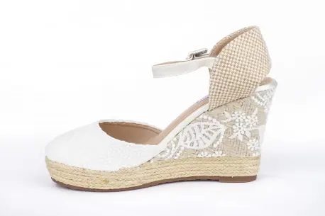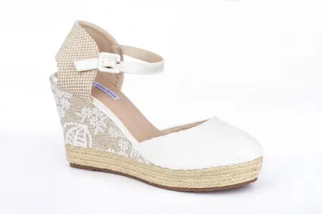 Alpargatas con plataforma y cuña alta de esparto cubierto de encaje, que le da un toque más femenino. Punta cerrada redonda y cierre con correa y hebilla. Color blanco muy elegante,. Frescas y a la moda.