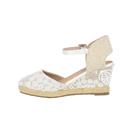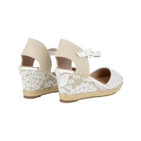 Alpargatas de cuña media bordada diseño floral. Fabricadas con telas suaves y elegantes perfectas para un día especial. Cierre de correa con hebilla ajustable.