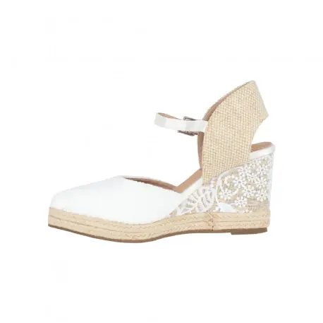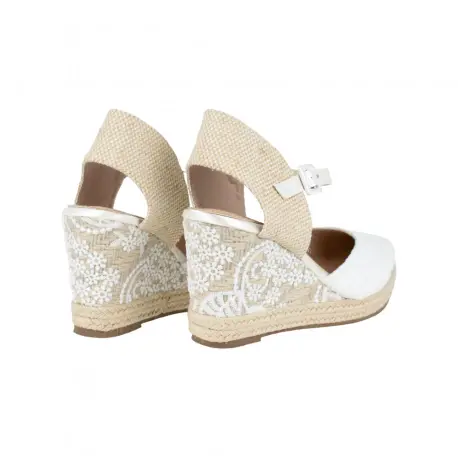 Estas sandalias están fabricadas en tela y tienen una cuña recubierta por encaje que le da un toque elegante y femenino.