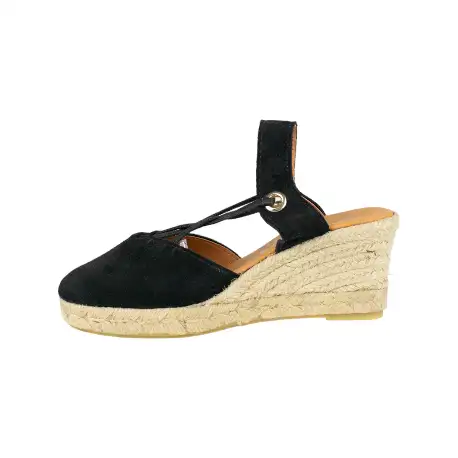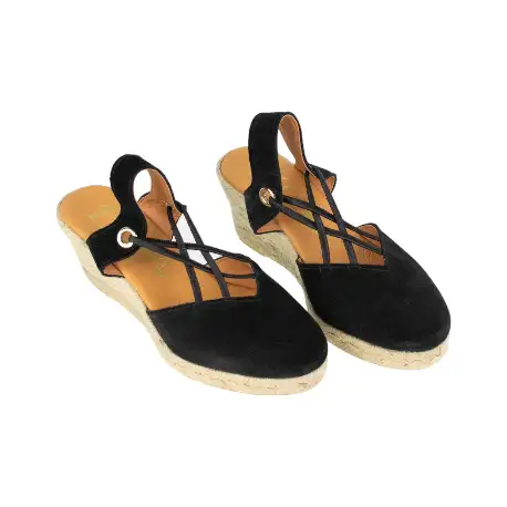 Elaboradas en suave serraje y adornadas con un detalle de elásticos cruzados, estas cuñas ofrecen un ajuste cómodo y seguro que se adapta a tus movimientos.