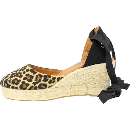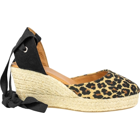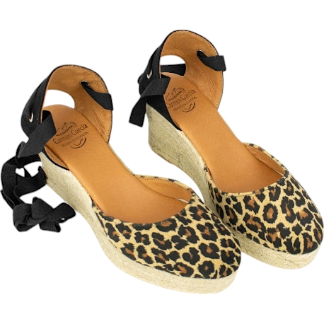 Pon un toque atrevido a tus conjuntos de Verano, con las cuñas de esparto estampado de leopardo de Carmen García. Con sus 7 centímetros de tacón y su plataforma, estarás cómoda y estable.