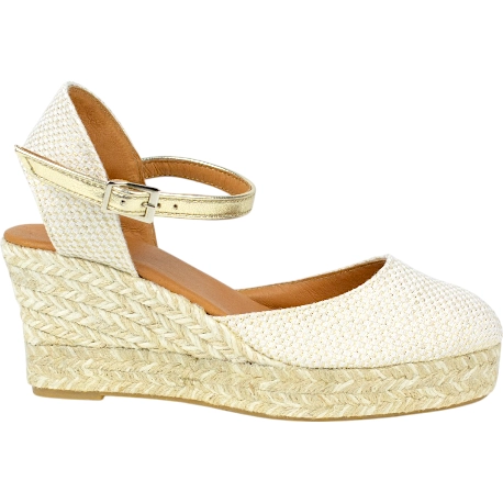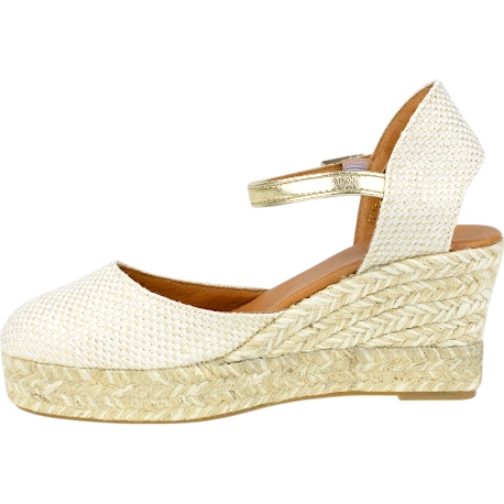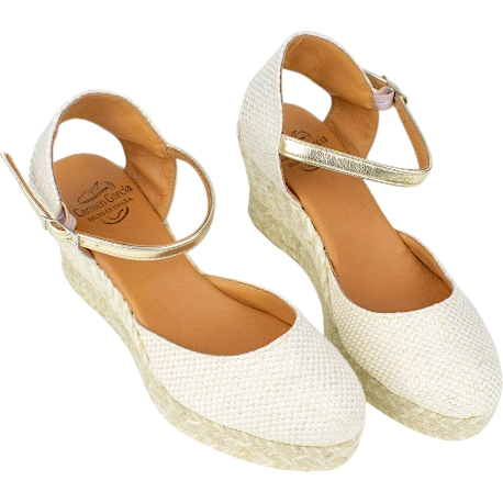 Cómodas y femeninas, las cuñas de esparto de Carmen García son un básico del Verano. El modelo 298JB está fabricado con tejido Casa Blanca, con bello punto en color platino.