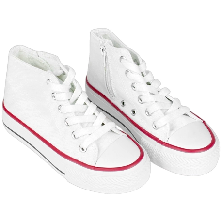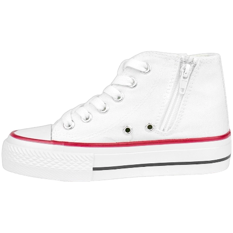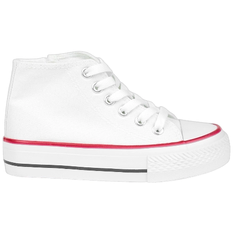 Zapatillas deportivas estilo lona de caña alta, diseño en color blanco con línea roja, y puntera de goma. Cierre de cordones y cremallera lateral.