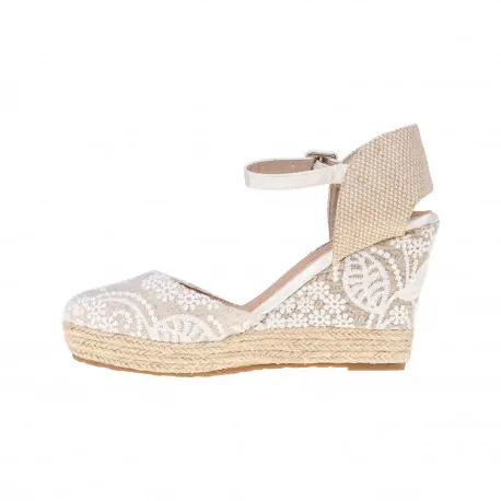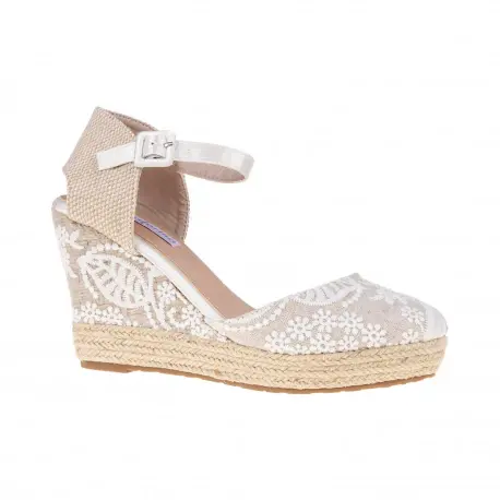 Zapatilla de esparto recubierto de encaje ,con plataforma y cuña alta en color beis y blanco combinados. Punta redonda cerrada y cierre con hebilla. Muy elegante y femenina, perfecta para ceremonia o fiesta.