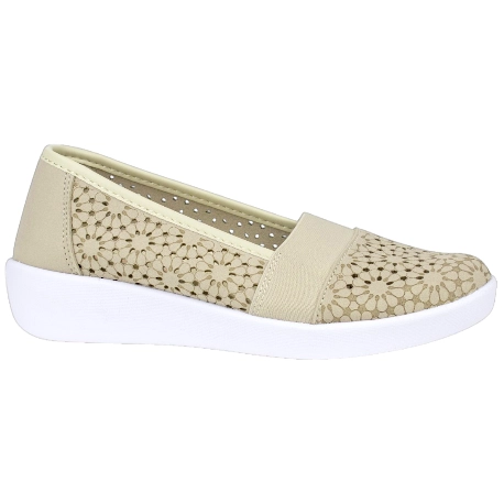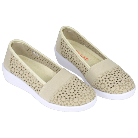 Zapatos de Verano estilo manoletina, fabricados en telas color beis, con troquelado láser, lo que le da sus diseños florales tan característicos.