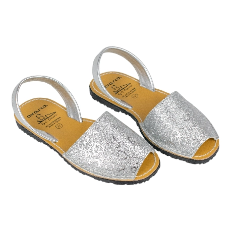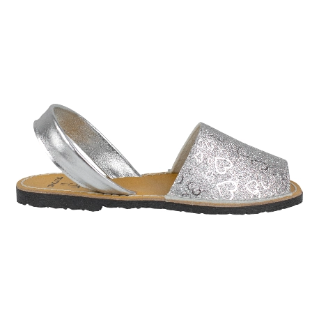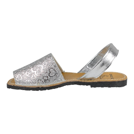 Coquetas y ligeras menorquinas plateadas para mujer con motivo de corazones y glitter. En color plata fácil de combinar con cualquier atuendo de Verano.