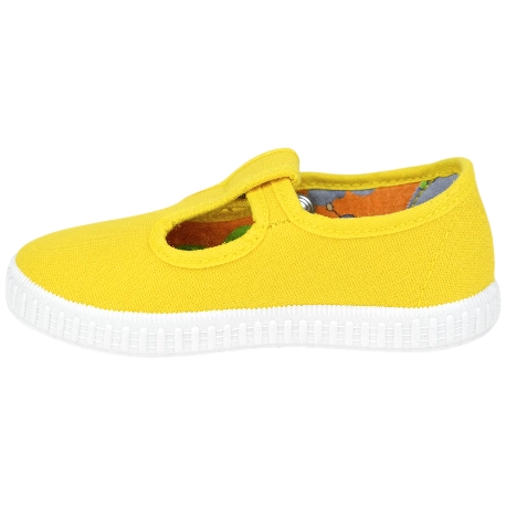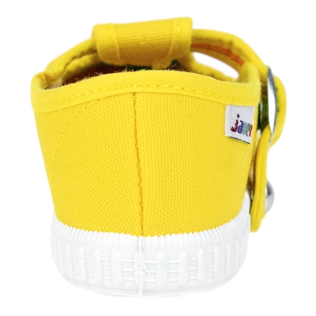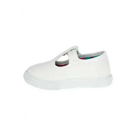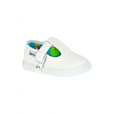 Zapatilla de lona estilo mercedita para niños, diseño en color liso azul marino, rojo y blanco. Cierre de botón de clip, la hebilla es decorativa.