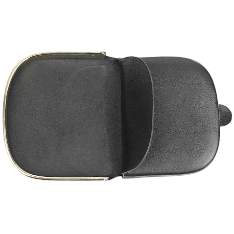 Práctico y elegante monedero pequeño fabricado en piel genuina color negro con armazón metálica dorada. Se abre con una tira y cuenta con un bolsillo monedero pequeño y un espacio más grande para billetes o pertenencias pequeñas.