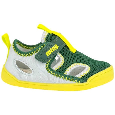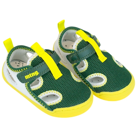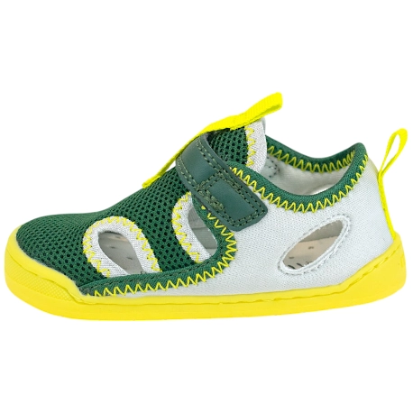 Sandalias respetuosas para niños en color verde con detalles grises y amarillos. Fabricada con materiales veganos certificados, y con todas las cualidades barefoot.