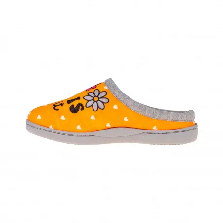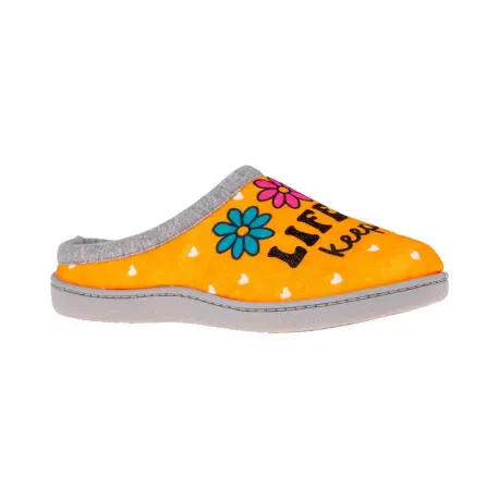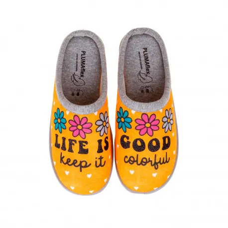 Zapatilla descalza de estar por casa, diseño en color amarillo vibrante con frase "life is good keep it colorful" con flores.