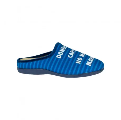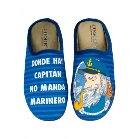 Estas zapatillas abiertas en color azul marino destacan por su estampado y la inspiradora frase "donde hay capitán no manda marinero".