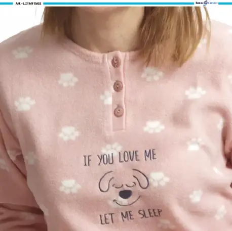 Pijama de mujer Lacotex LCT691502 Polar: una combinación de comodidad y estilo. La camisa de manga larga presenta un cuello con tapeta y 3 botones, junto con un encantador estampado de huellas de perros.