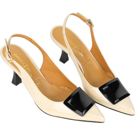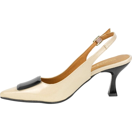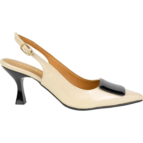 Zapato de salón de estética delicada y limpia, mezclando color beis con detalles en negro. Diseño destalonado con cierre de hebilla, y punta fina, que estiliza la figura.