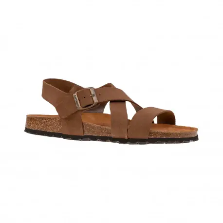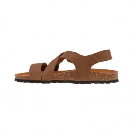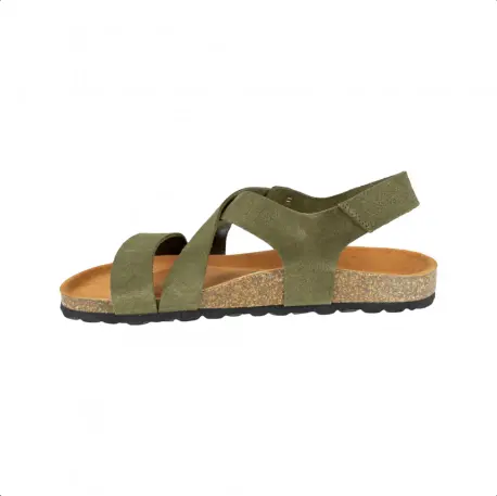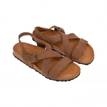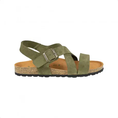 Sandalia bio de tiras cruzadas fabricado enteramente en piel natural color marrón y verde utilizando medios artesanales. Plantilla anatómica con acolchado carbónico que nos aporta comodidad duradera y un correcto descanso.
