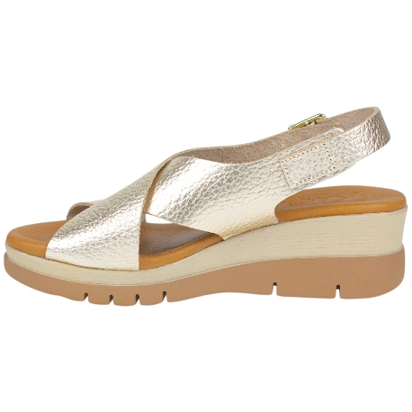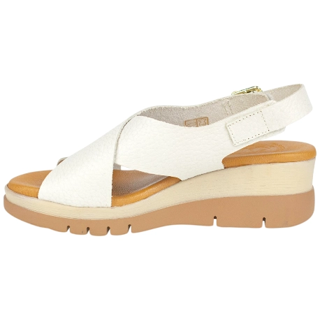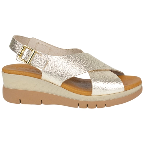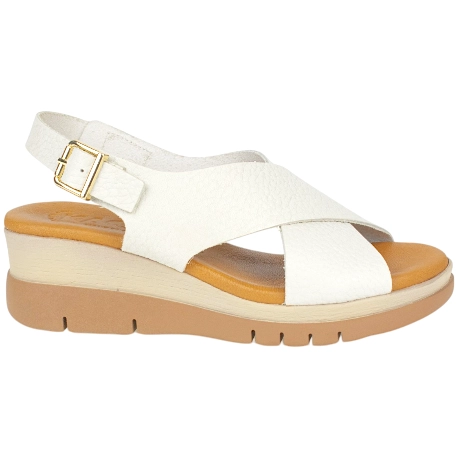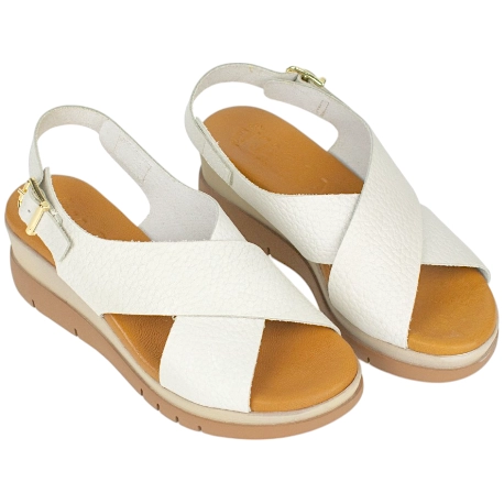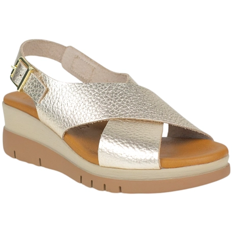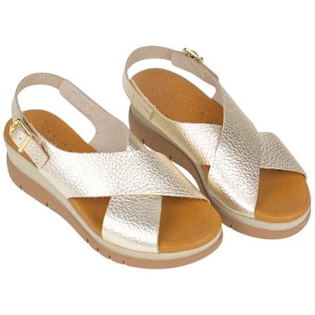Sandalias fabricadas enteramente en piel, diseño de tiras cruzadas con cierre de hebilla lateral. Su cuña de 4.5cm se apoya en su plataforma, dando una pisada más cómoda y segura.