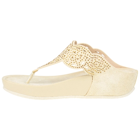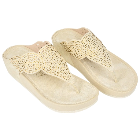 Esta no es una sandalia bonita más. Es la respuesta inteligente a la eterna pregunta: ¿estilo o confort? Su diseño tipo esclava en un versátil tono beige se ilumina con una pala troquelada, salpicada de cientos de diminutos cristales de strass que reflejan la luz del sol de día y las luces de una terraza de noche. Su secreto mejor guardado es la estructura: la cuña de 4.5 cm te eleva de forma inteligente, ya que la plataforma delantera reduce la inclinación real del pie. El resultado es una postura estilizada, caminando con una estabilidad y confianza que un tacón tradicional no puede ofrecer.