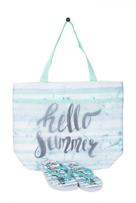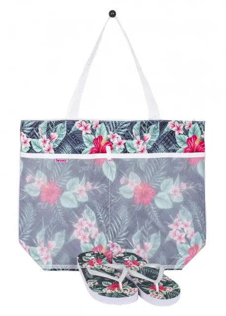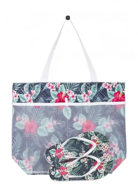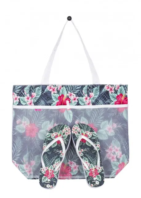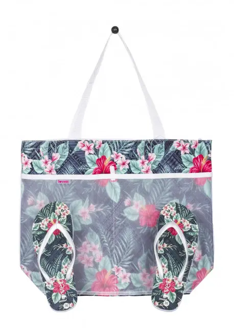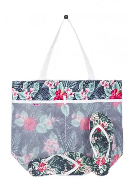 Sandalias de goma con un bolso de playa con diseño a juego. Estilo esclava de goma estampada estilo Hawaiana.