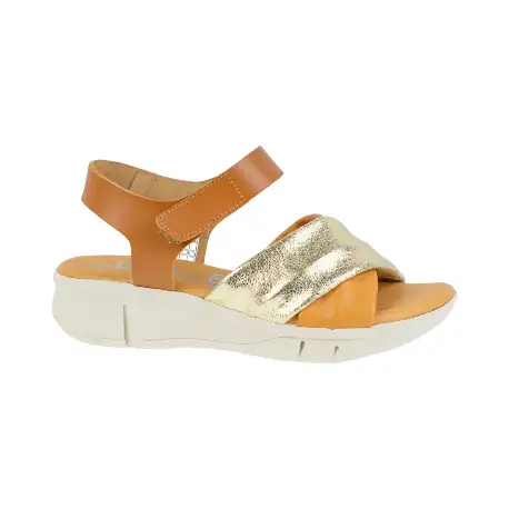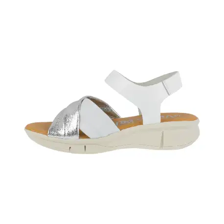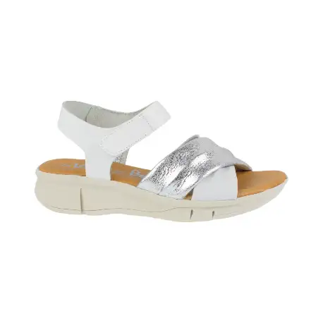 Sus tiras cruzadas en piel tubular en los vibrantes colores Blanco-Plata y Cuero-Platino añaden un toque de sofisticación a cualquier atuendo. La plantilla de piel con efecto gel garantiza una sensación de suavidad y confort durante todo el día.