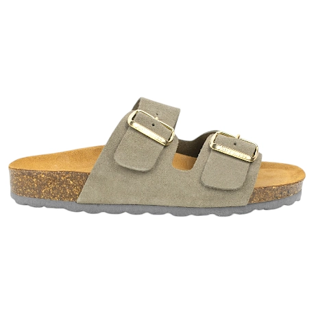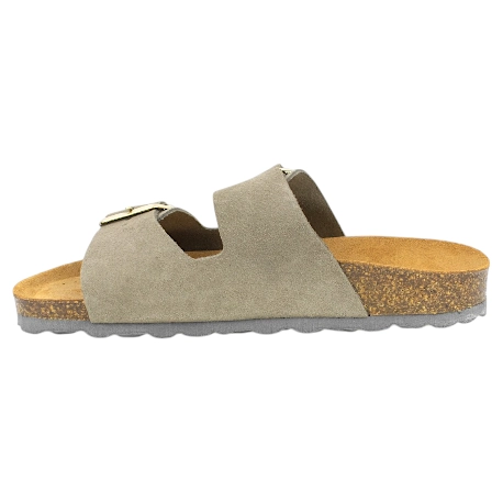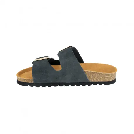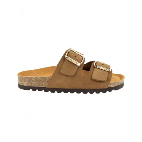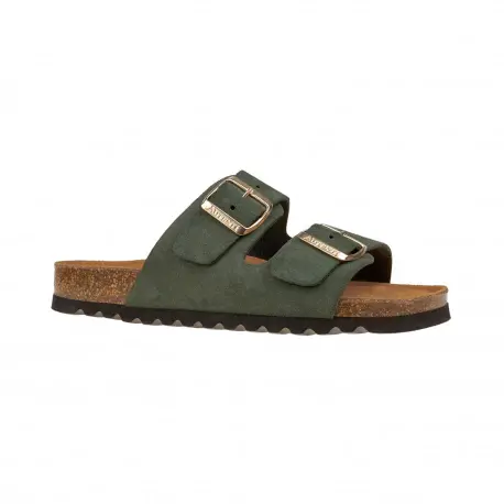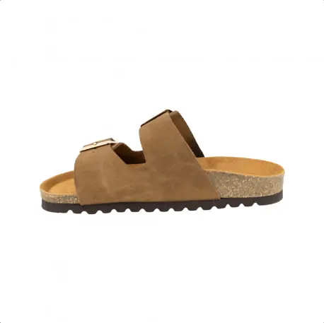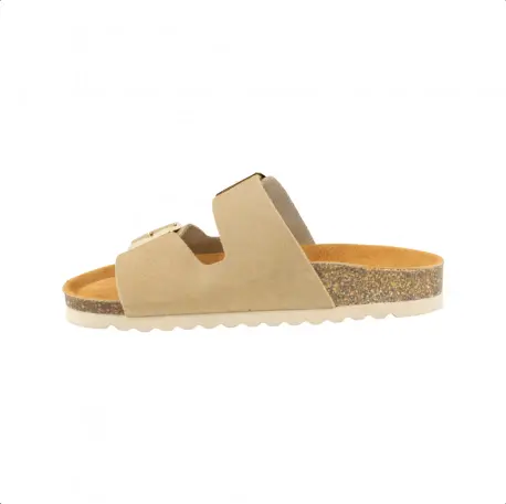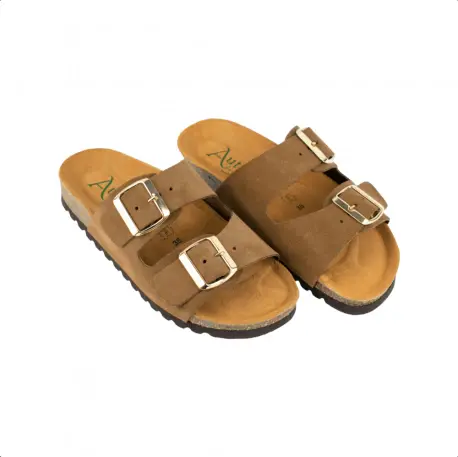 Sandalia bio, fabricada en seraje (piel) natural color negro, beige, marrón y verde. Plantilla que incorpora sistema de acolchado carbónico siempre respetando su diseño anatómico. Planta de corcho 100% natural. Diseño con doble cierre de hebillas ajustables para que se adapten mejor al ancho del pie. Calza normal.