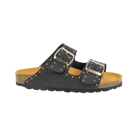- ✅ Detalle Único de Tachuelas Doradas: Un toque de distinción y tendencia que eleva el diseño clásico de la sandalia de doble hebilla.