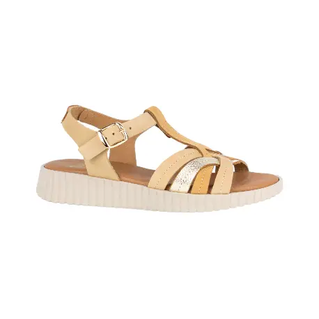 Descubre la elegancia y comodidad con las sandalias de piel Studio Scarpe, modelo SN132656. Este diseño semi plano, con una altura de 1.5 a 3 cm, presenta un estilo distintivo de cuello T y tiras entrelazadas en colores camel y hielo.