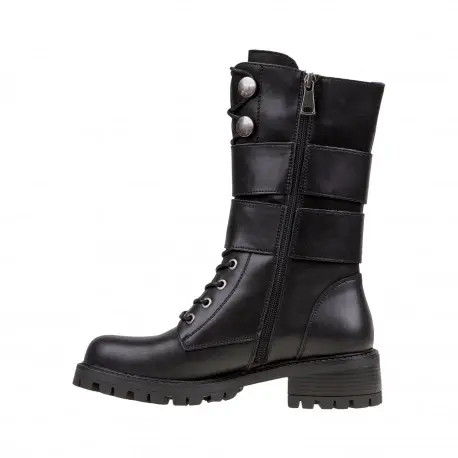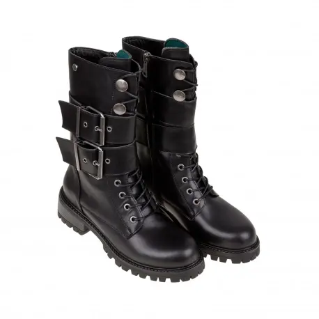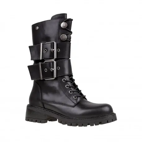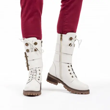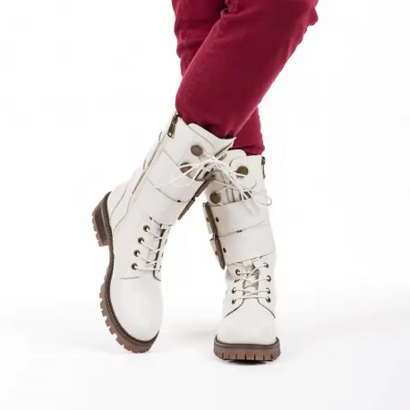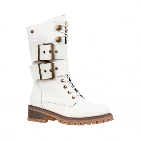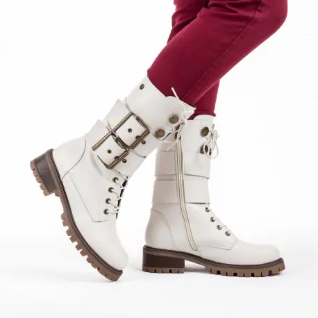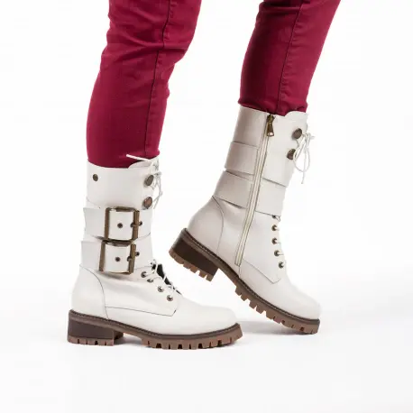 Botas Blancas estilo militar muy cómoda fabricada en piel. Cierre con cremallera interior. Dos hebillas decorativas alrededor para un estilo más cañero y juvenil. Suela ligera antideslizante.