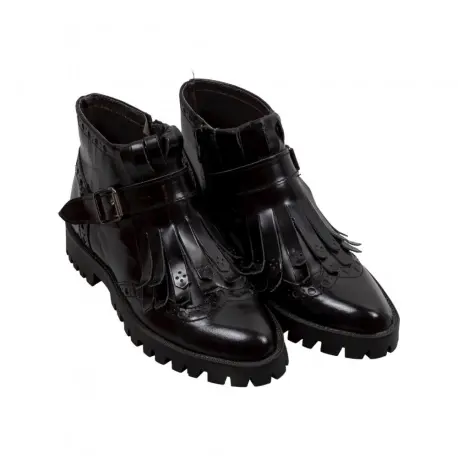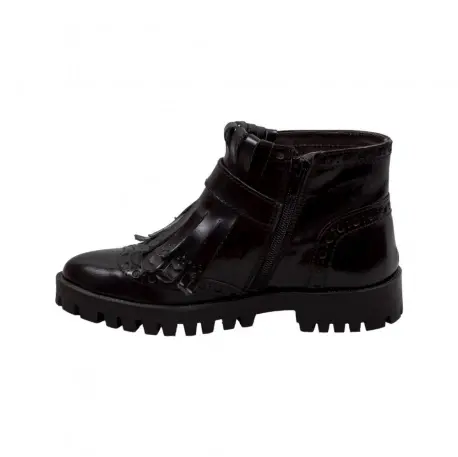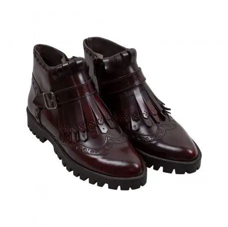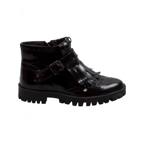 Botín de estilo versátil para mujer, fabricado en piel de buena calidad color negro y granate oscuro. Diseño con flecos en el empeine, hebilla decorativa y cierre de cremallera. Punta florenti y suela de goma con tacón de 3 centímetros.