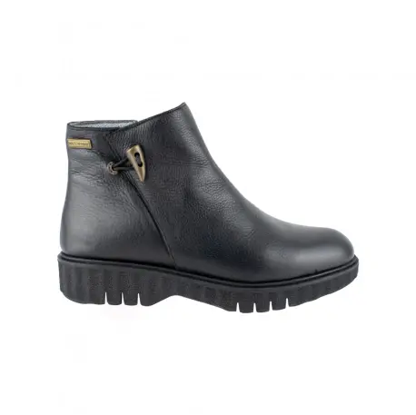 Botín casual en color negro, fabricado en piel de primera calidad. Cierre de cremallera interior. Forro interior con membrana impermeable KAM-XTREME, que protegerá tus pies tanto de la lluvia como del frío. Plantilla extraíble muy cómoda que se adapta al pie. Suela de goma con tacón ancho de 3,5 centímetros.