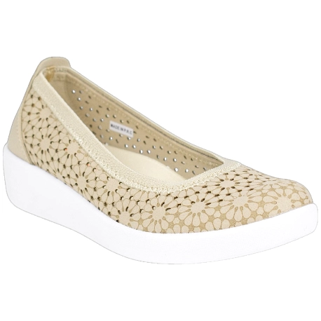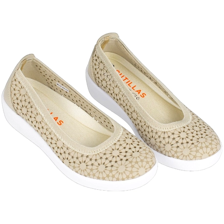 Estas bailarinas de descanso están fabricadas en tejido con picados láser, que mejoran la ventilación al pie y dan un diseño bonito y único. Cuentan con plantilla extraíble y suela de goma súper ligera de 3cm. de altura.