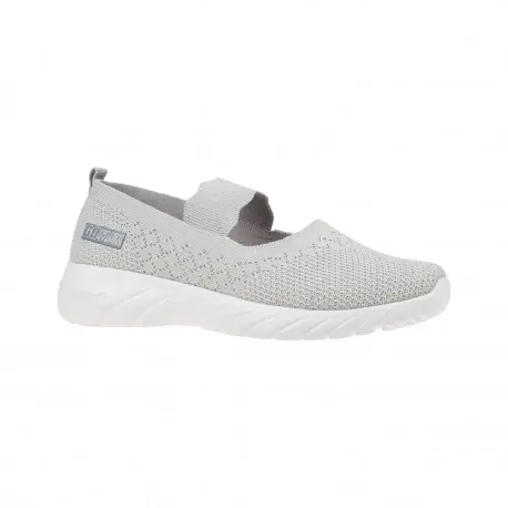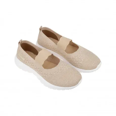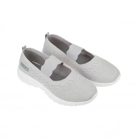 Zapatilla deportiva estilo Mercedita fabricada en tela fresca, perfecta para el verano. Disponible en color gris y beis con suela blanca.