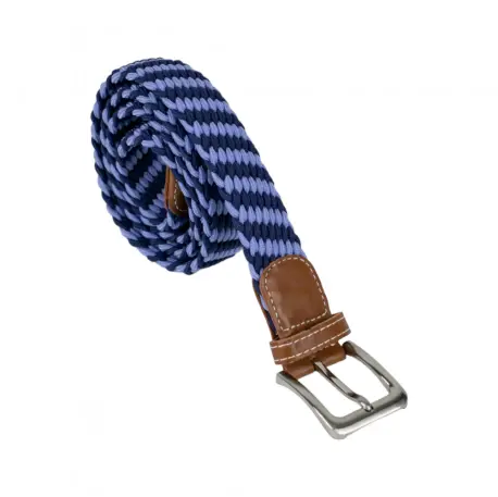 Cómodo cinturón fabricado en tela elástica en colores azules, detalles de piel marrón y hebilla de metal. Estilo casual.