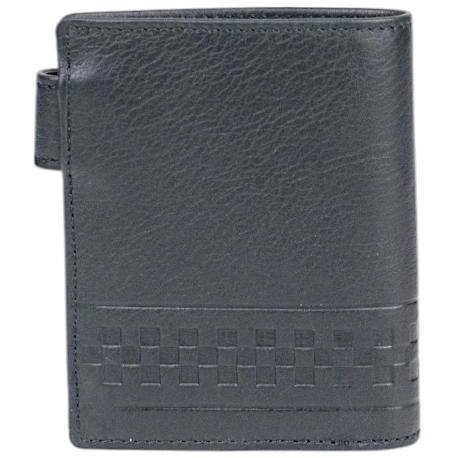 Billetera elegante fabricada en piel auténtica color negro con detalle azul. Su diseño vertical con cierre de botón cuenta con 6 ranuras tarjeteras, un monedero con cierre de botón, espacio para documento personal, bolsillo libre interior y bolsillo para billetes con separación.