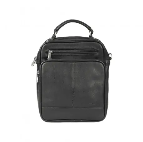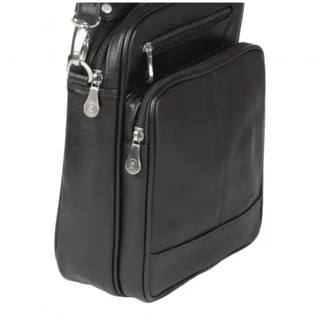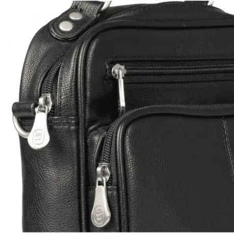 Bolso tipo reportero fabricado en piel sintética de alta calidad, tiene varios compartimentos que cierran con cremallera. Cuenta con dos tipos de asas: de mano y bandolera ajustable.