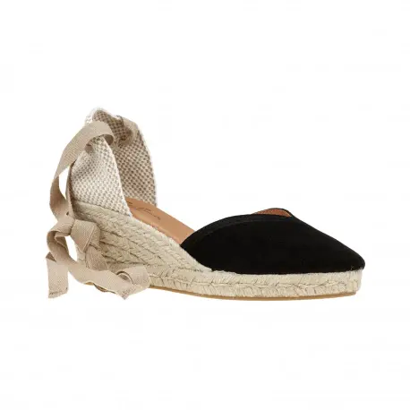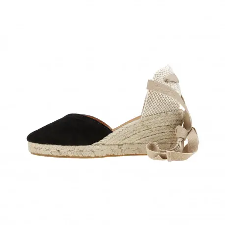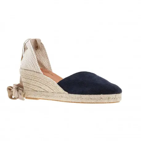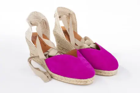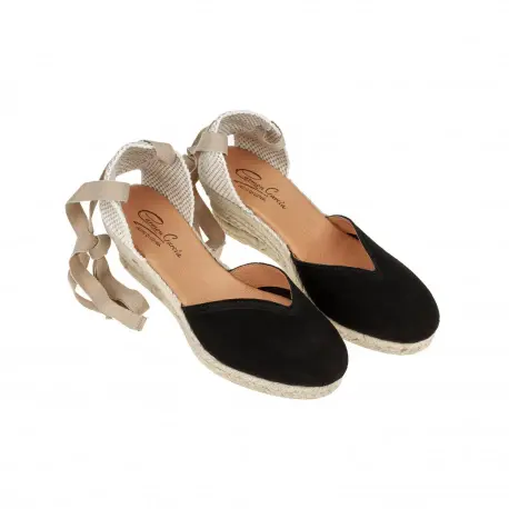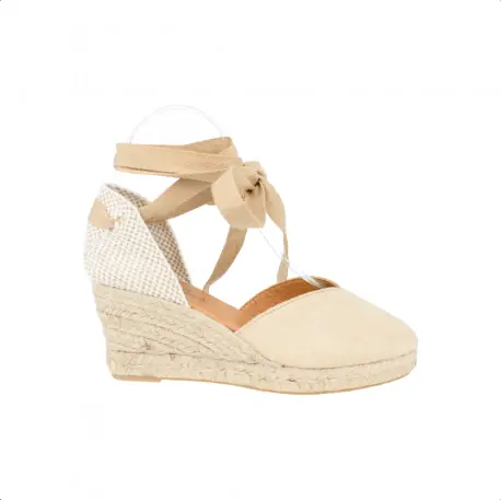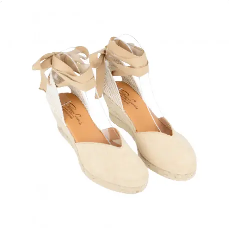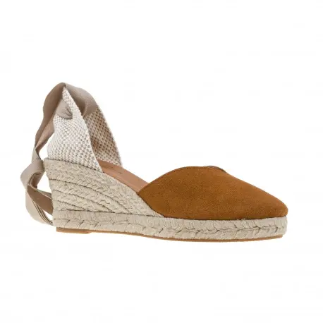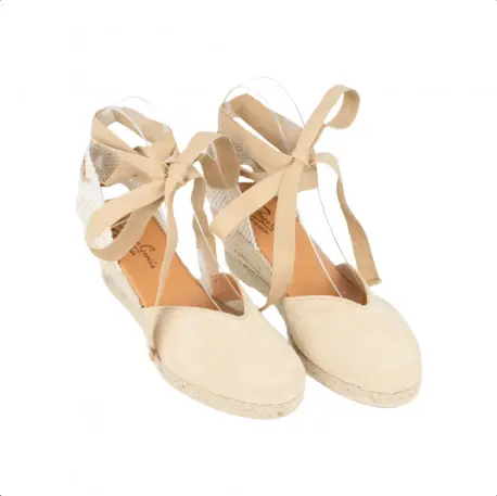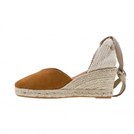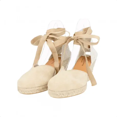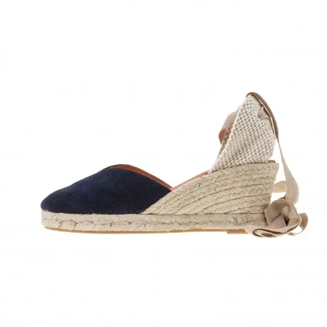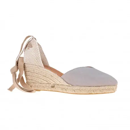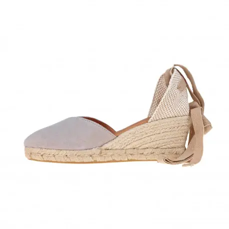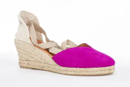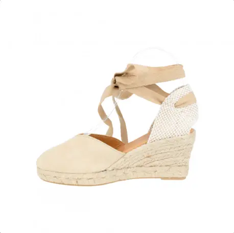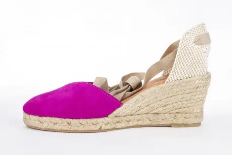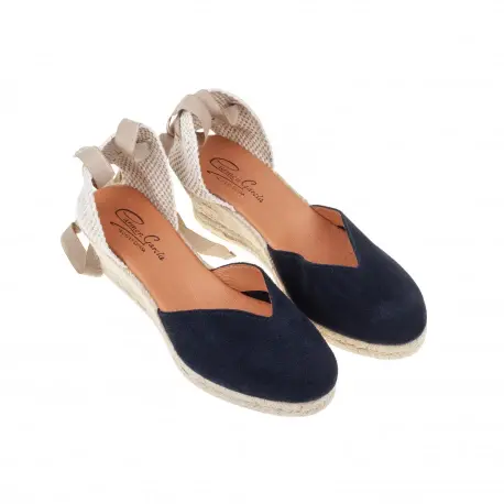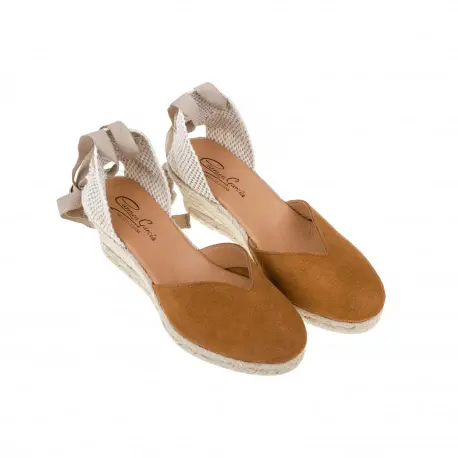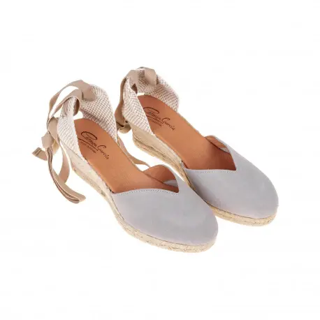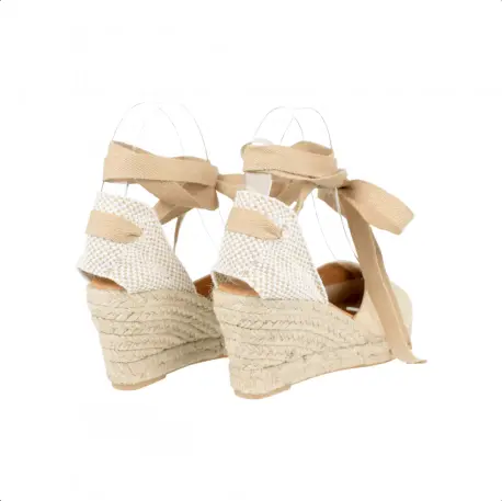 Cuñas de esparto de cinco cuerdas de estilo elegante y cómodo. Fabricada enteramente en piel con talonera de tela. Con una altura de 7 cm esta cuña de esparto resulta muy cómoda gracias a la plataforma y su composición en esparto natural. Destaca su corte en forma de V que recoge perfectamente el pie y se adapta con mayor facilidad al ancho. Las tiras de algodón se pueden atar hasta casi la mitad de los gemelos.