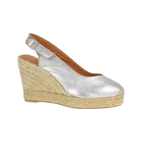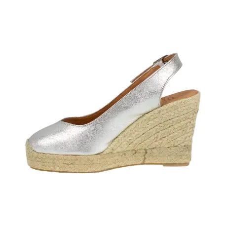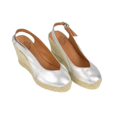 ¡Eleva tu estilo con la cuña de esparto Carmen García 288D7P. Este elegante salón destalonado en color platino ofrece un toque de sofisticación. Confeccionada en piel de alta calidad y fabricada en España, esta cuña cuenta con 7 cuerdas que proporcionan una altura de 9 cm.