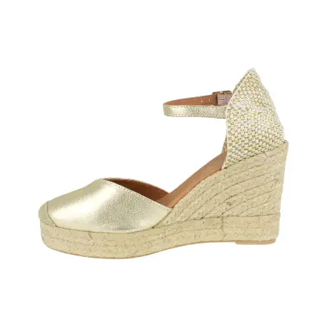 El cierre de pulsera con hebilla garantiza un ajuste seguro, mientras que la punta remontada añade un toque de sofisticación. Disponibles en colores dorado y blanco, estas cuñas son la opción perfecta para dar un toque de luminosidad a cualquier conjunto.