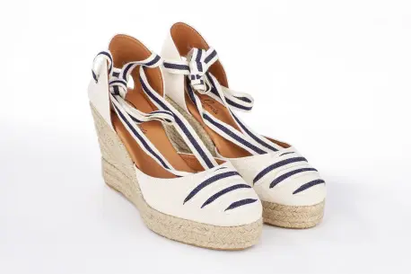 Exterior y forro en tejido de algodón. Plantilla de piel. Cuña de esparto natural reforzado con goma inyectada.